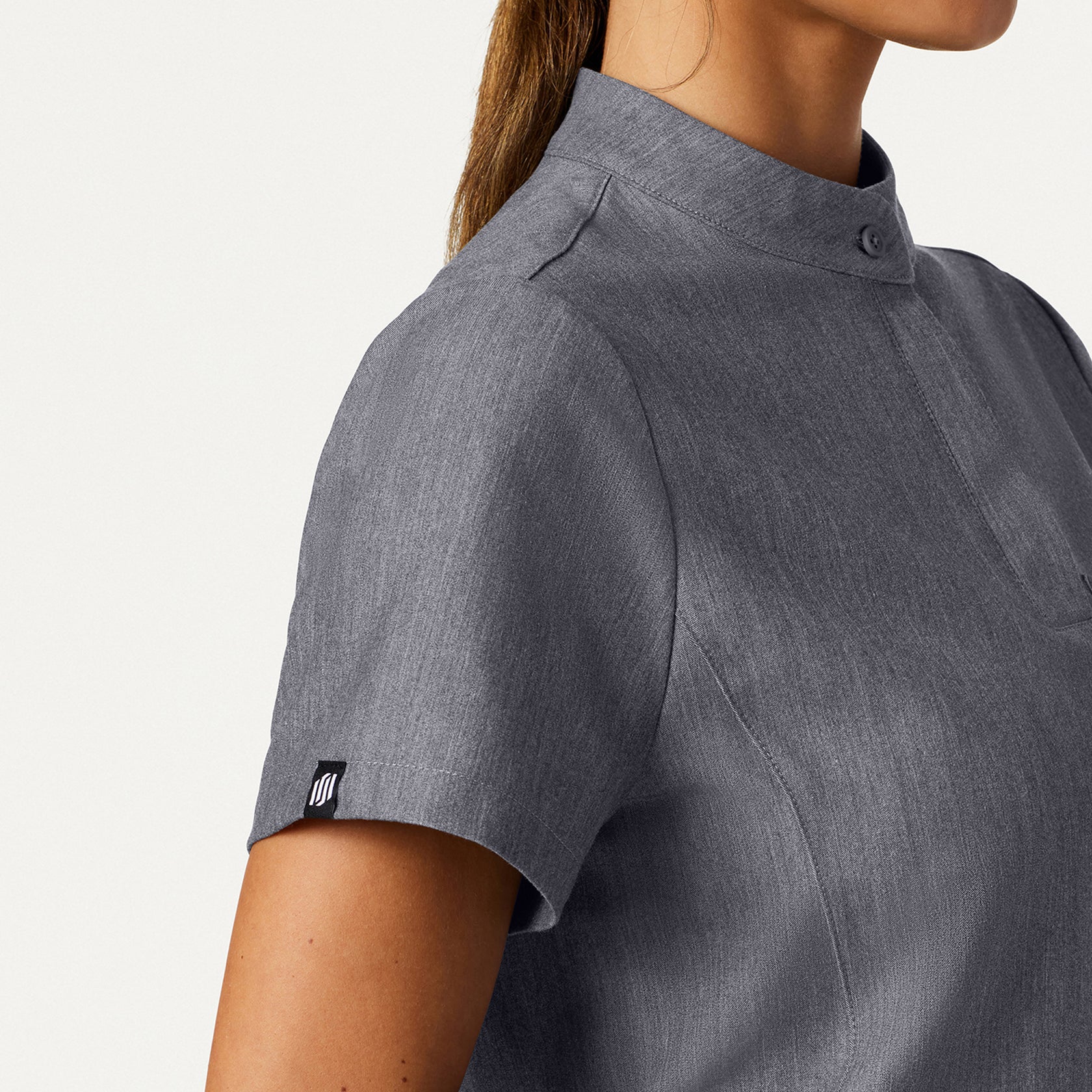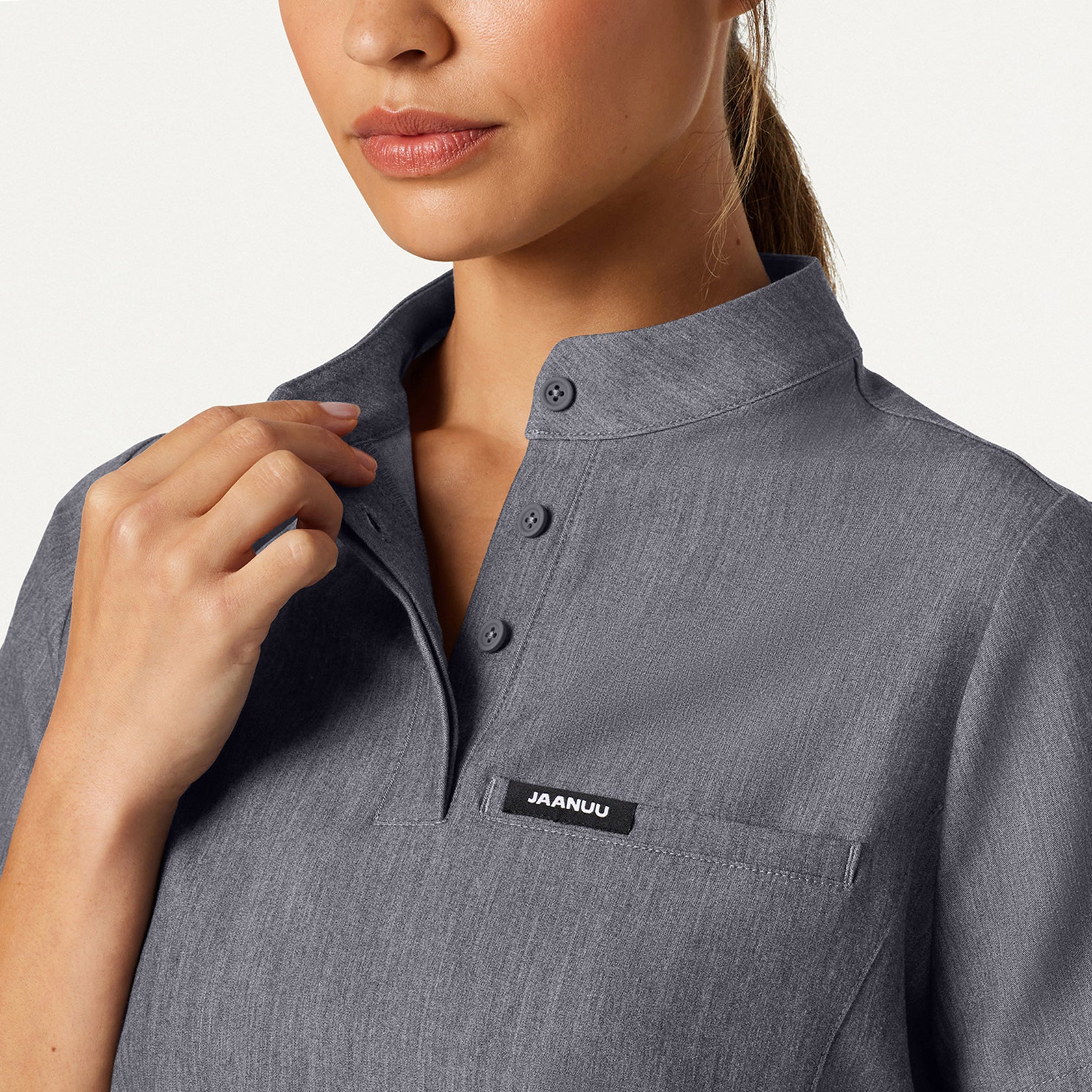 Our most essential fit gets a modern refresh with a banded collar and hidden buttons. This style pairs best with JAANUU UltraLAST™ scrub pants.